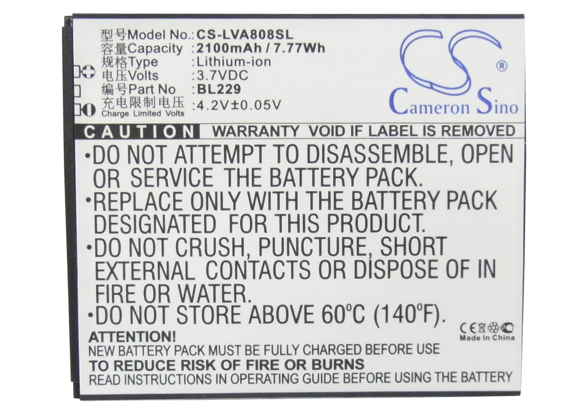 Battery for Lenovo A8 BL229 3.7V Li-ion 2100mAh / 7.77Wh