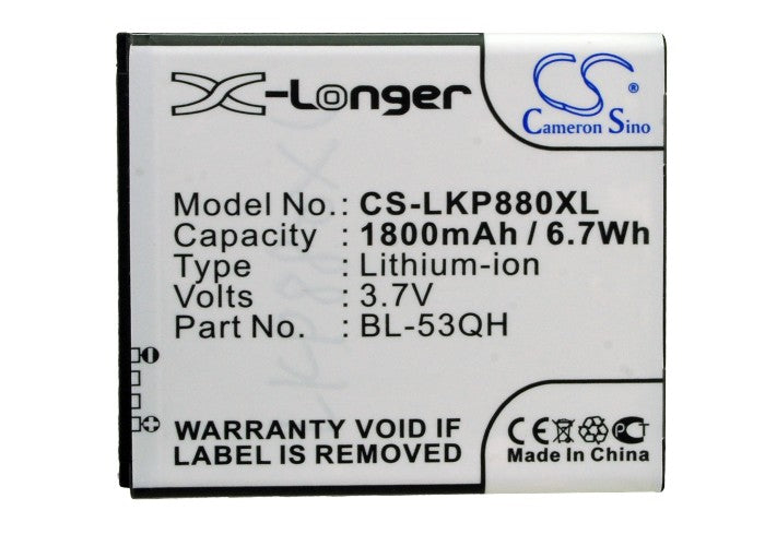 Battery for MetroPCS LGMS870 BL-53QH, EAC61878605 3.7V Li-ion 1800mAh / 6.66Wh