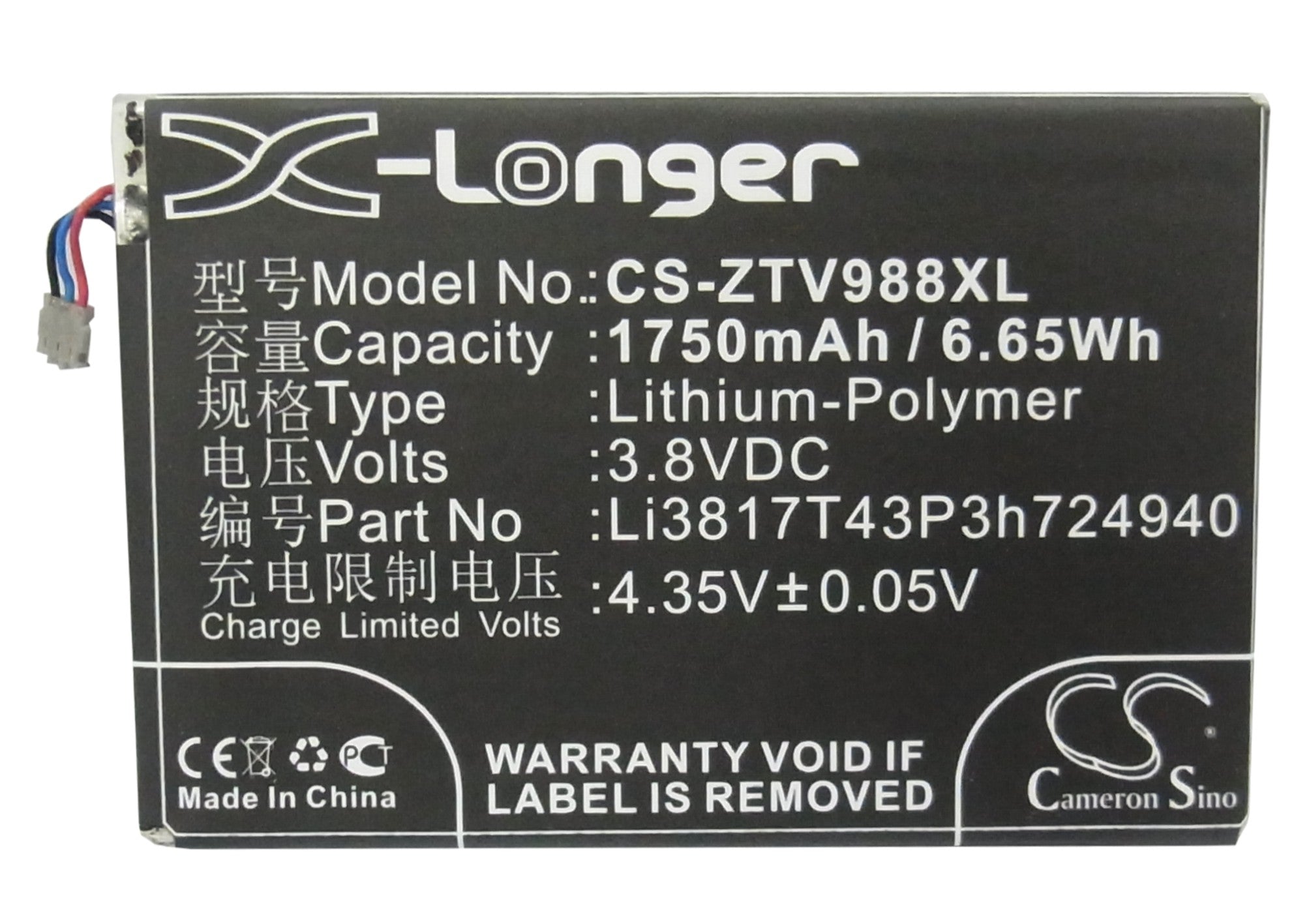 Capacity: 1750mAh 6.65Wh