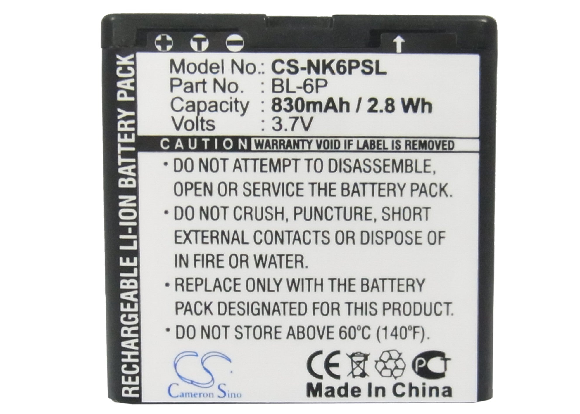 Battery for Nokia 7900 BL-6P, BP-6P 3.7V Li-ion 830mAh / 3.07Wh