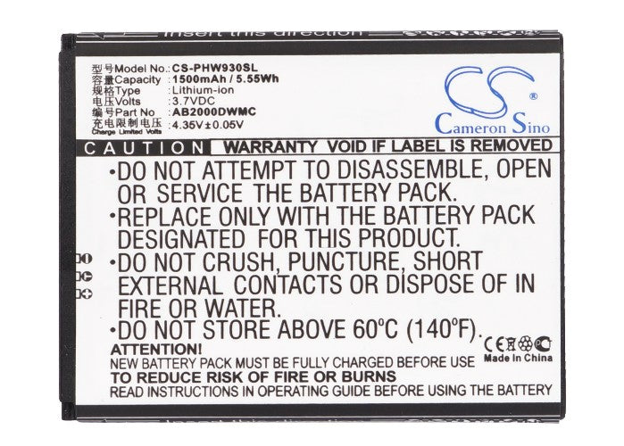 Battery for Philips W930 AB2000DWMC 3.7V Li-ion 1500mAh / 5.55Wh