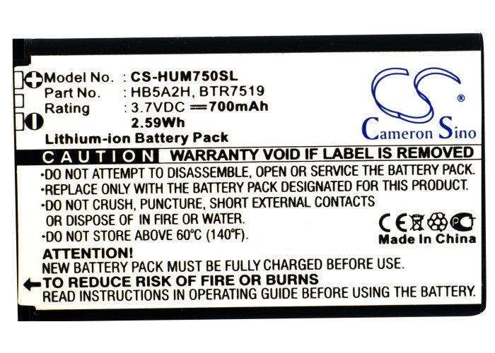 Battery for T-Mobile Pulse Mini BTR7519, HB5A2H 3.7V Li-ion 700mAh / 2.59Wh