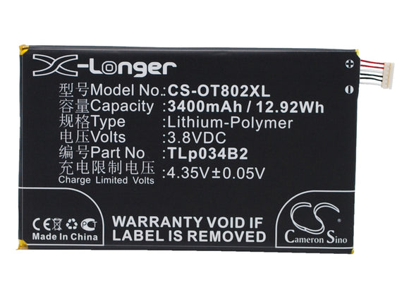 Battery for Alcatel One Touch Pop S9 TLp034B1, TLp034B2 3.8V Li-Polymer 3400mAh