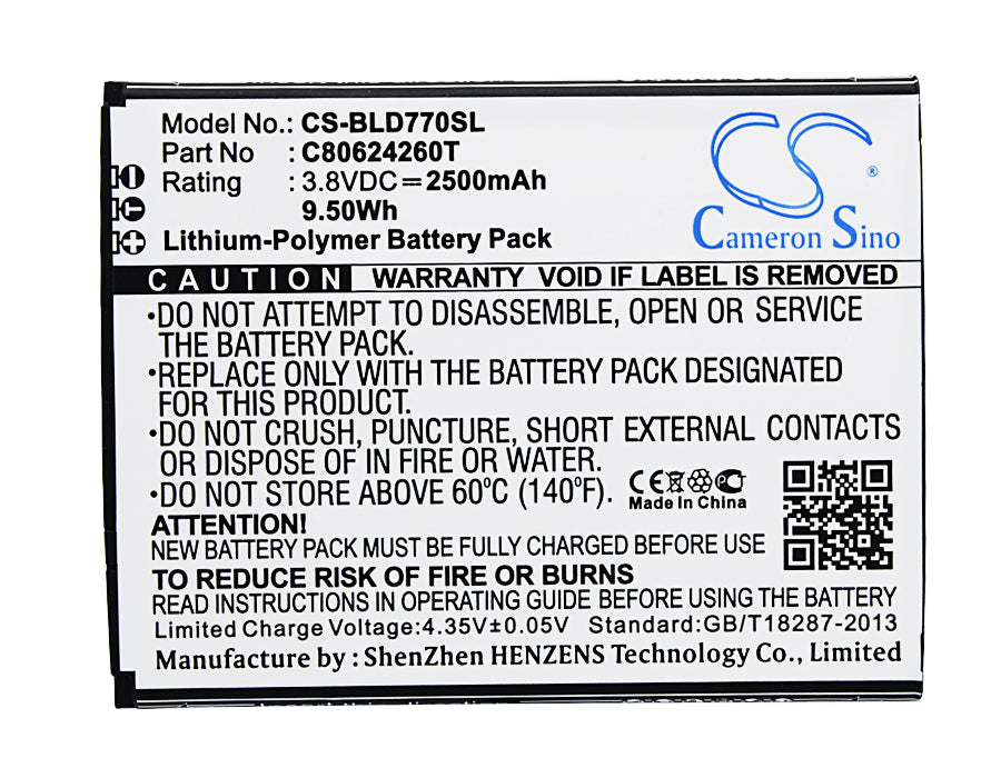 Battery for BLU D770U C80624260T 3.8V Li-Polymer 2500mAh / 9.50Wh