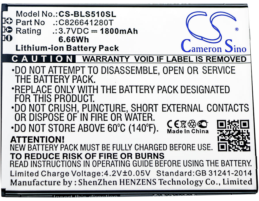 Battery for BLU S510 C826641280T 3.7V Li-ion 1800mAh / 6.66Wh