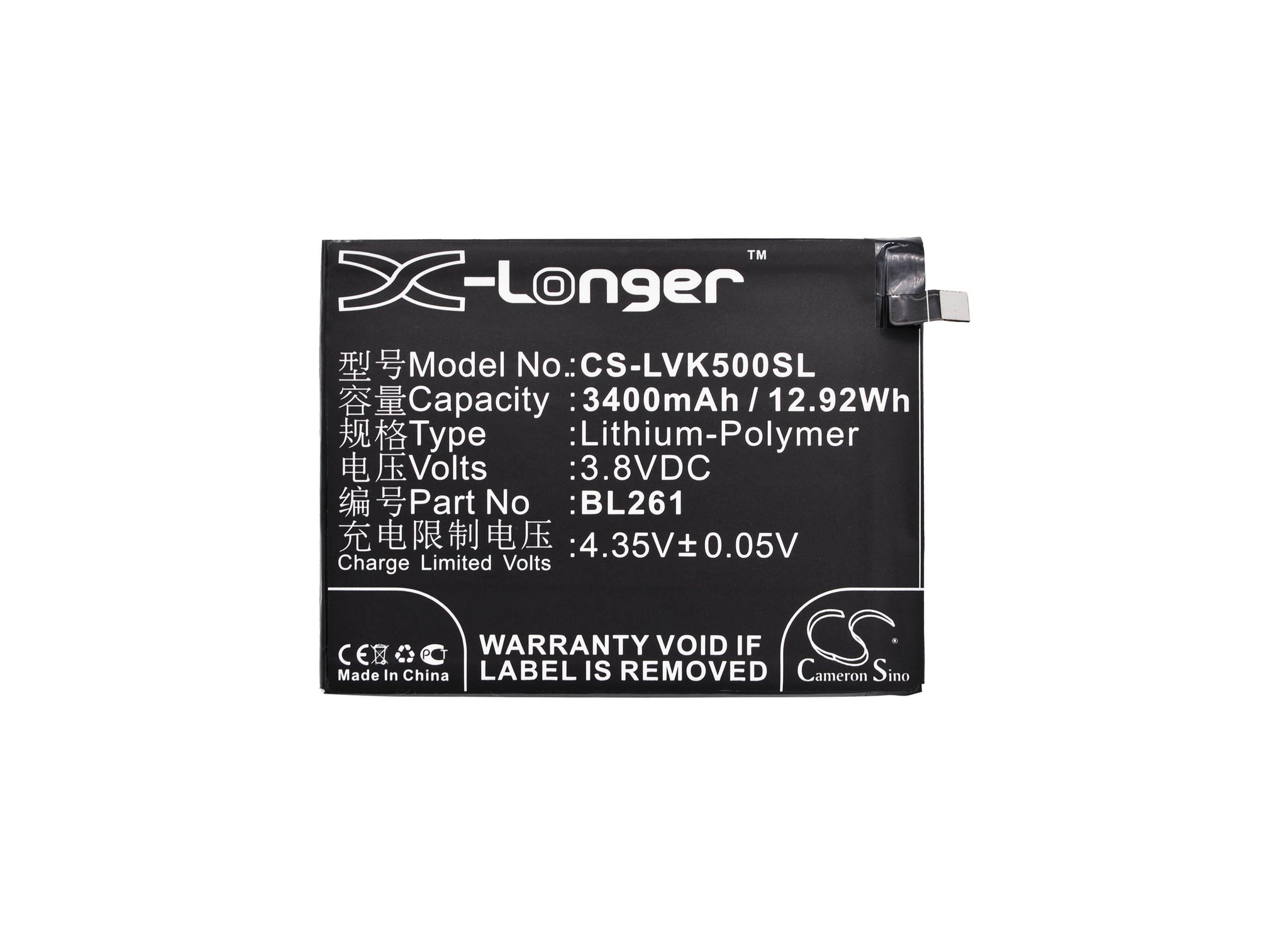 Battery for Lenovo K5 Note BL261 3.8V Li-Polymer 3400mAh / 12.92Wh
